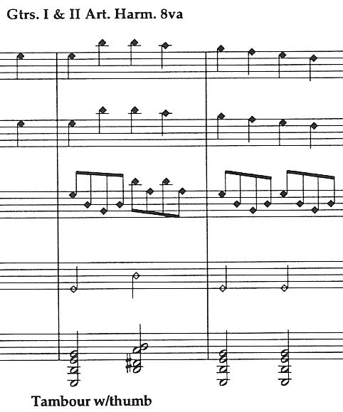 This beautiful arrangement uses many guitaristic devices to keep things interesting. There are extended passages of artificial harmonics and use of the thumb "tambour" technique. Difficult. No fingering. |